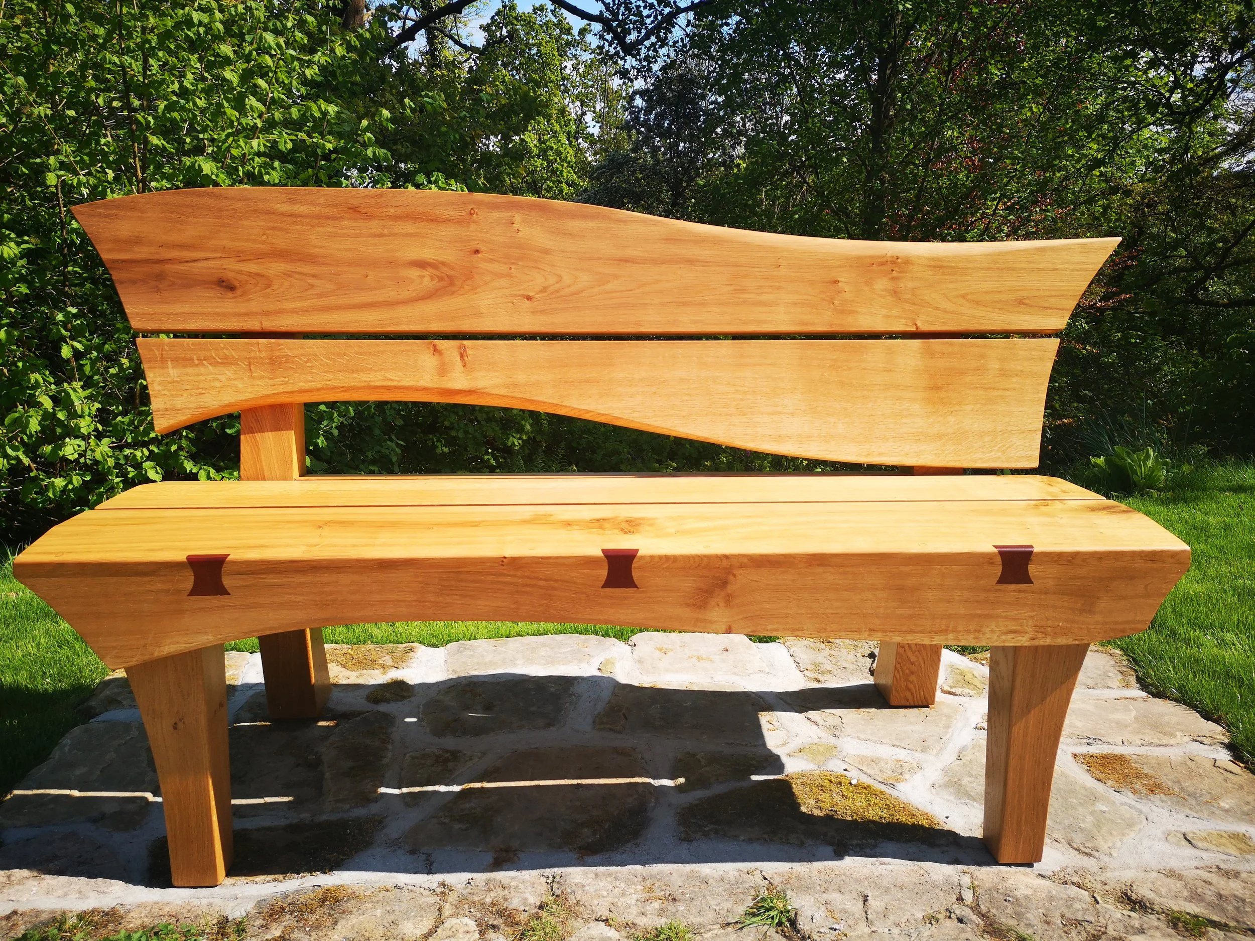 A hand crafted wooden garden bench with a curved backrest and seat, showcasing handmade dovetail joints situated on a stone pavement with green grass and trees in the background.